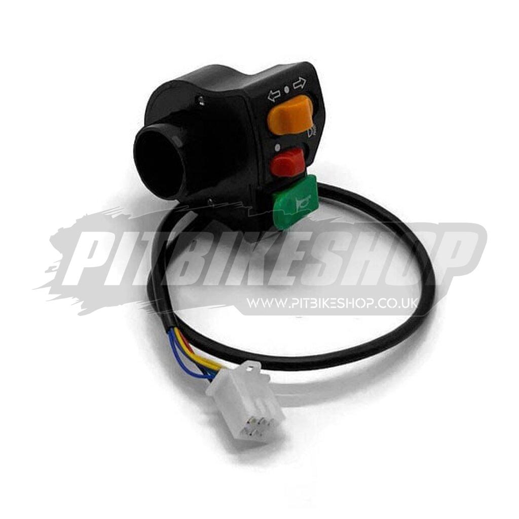 It has a button for your horn, it has left and right turn signals and an ON/OFF button for your lights.